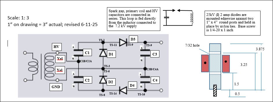 rests on top of the two tubes. The hole at the top of the vertical tube is for a parachute cord tie-down of the horizontal tube which contains the secondary winding). For storage, the spheres are removed and the vertical supports are removed from the base. Everything else easily disassembles. For experiments the Tesla primary and secondary coils can be lifted off the supports and moved to the test station. The primary is reconnected to the power supply by a long twisted pair "extension cord" that can handle 15kV safely. |