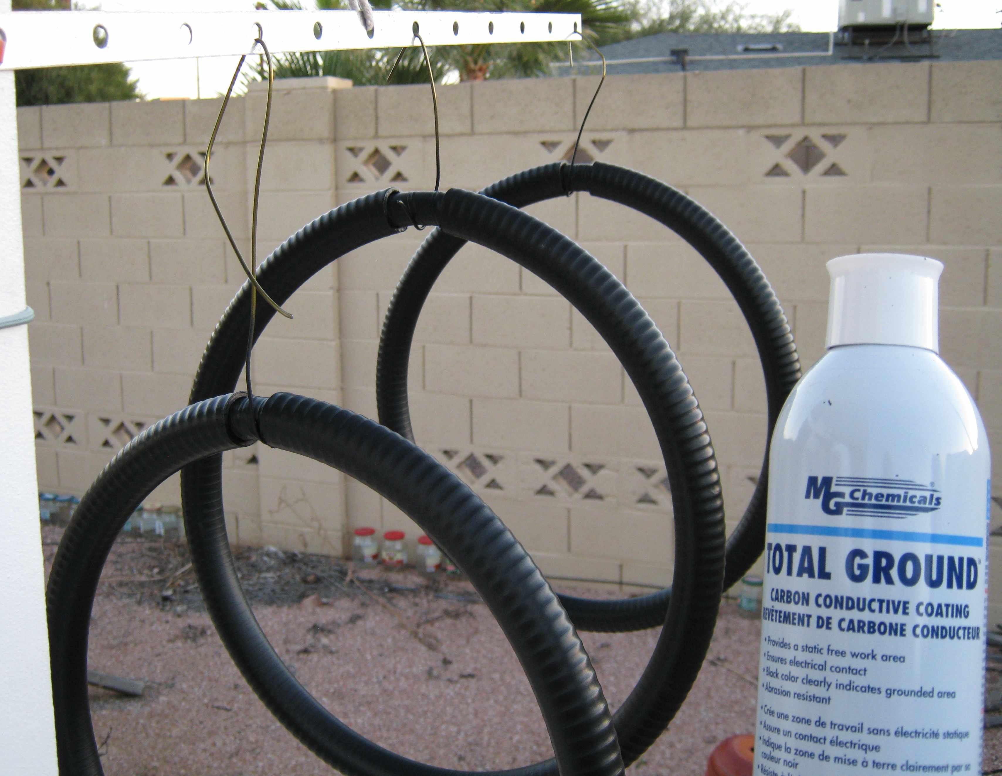 to take out the play. Cutting the beveled ends can be a bit tricky. Allow yourself some extra length so you can cut off your mistakes. The oriented bevels must be cut in a plane perpendicular to the corona ring plane. | The rings were made semi-conductive with two coats of MG