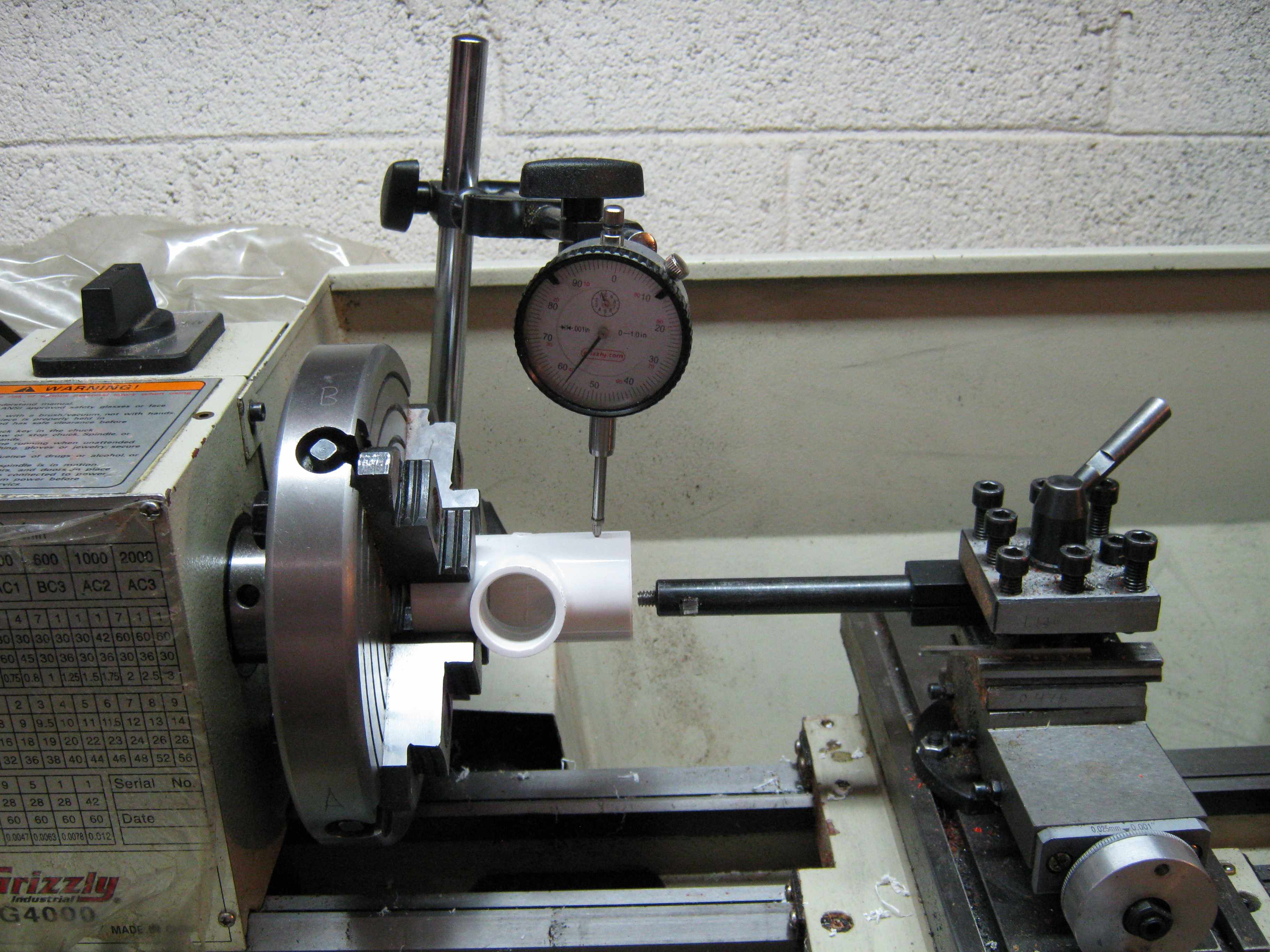 The PVC tee (schedule 40 (slip) 1" x 1" x 3/4") has an internal ridge which should be bored out to make the internal surface flush with the column tubes. | Clamp the 1" side of the tee in a 4-jaw chuck and then "dial it in" so that it is centered. Then bore out the ridge. |