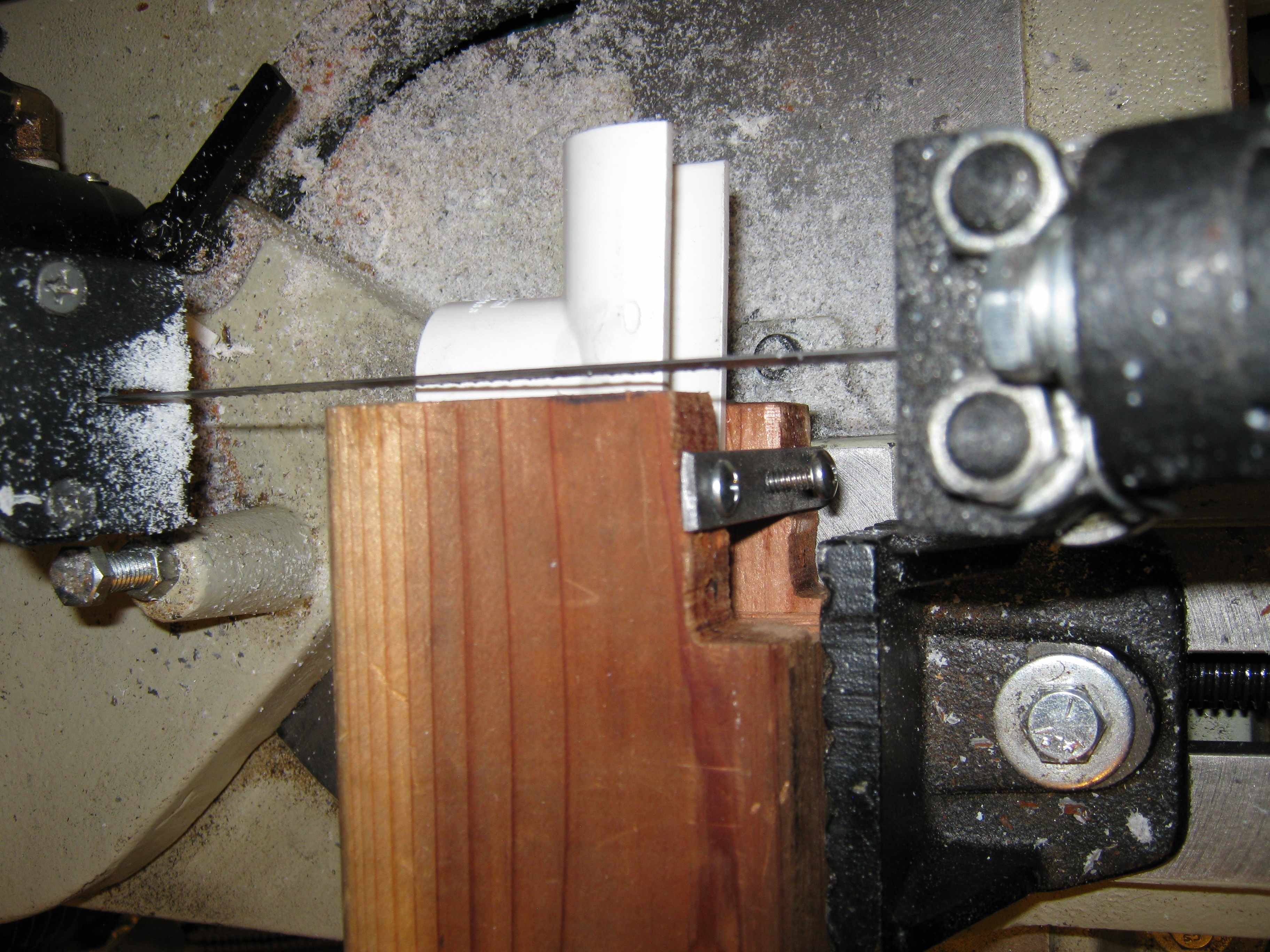 The fixture for the transverse cut is made by out of a 4" x 4" redwood block by drilling two perpendicular intersecting holes with a wood drill and drill press. Each hole is then cut in half to make two curved surfaces to hold the two curved surfaces of the tee. A metal strap is added to hold a presser foot to keep the tee in place. Silicone sealant is used to fill any gaps from oversized drilling (grease the tee first, or you will never get it back out after the sealant sets). | This is the completed fixture loaded with the longitudinal slice and ready to be placed in the band saw (shown above). |