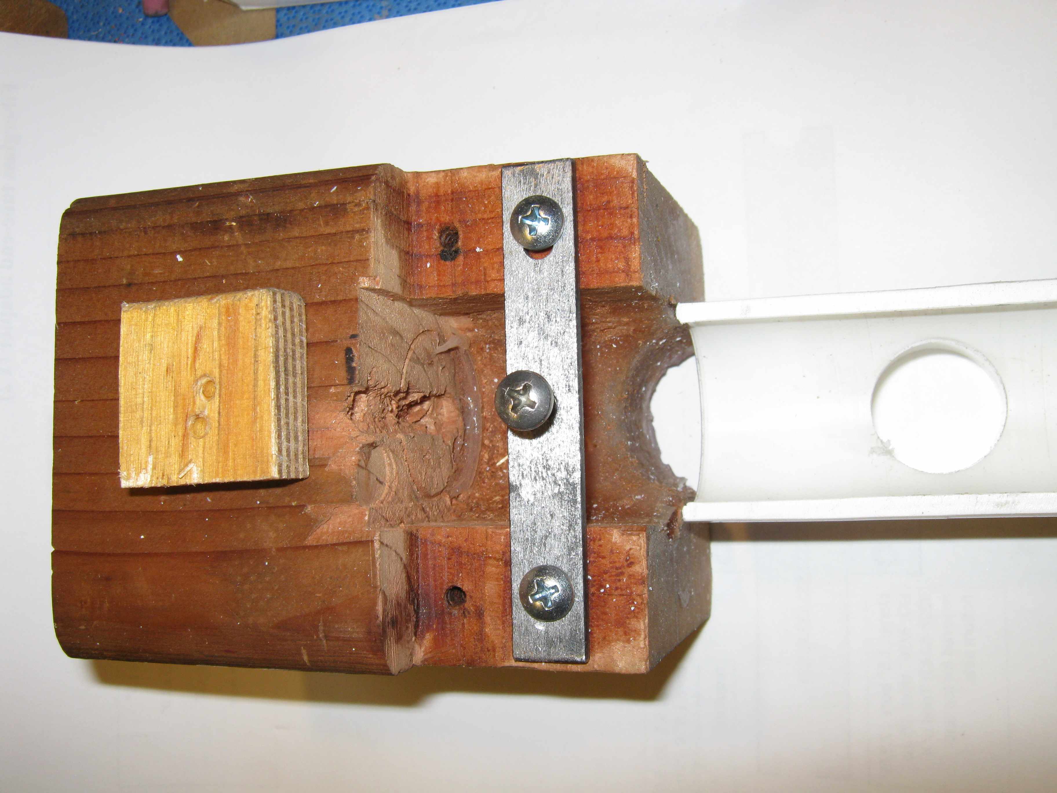 Here the holes in the upright angle iron are being "transferred" to the angle iron used on the wood base. The large bored out washers give an even footing to the PVC columns. | The lower ends of the PVC pipe are plugged with a solid cylinder (3") of polyethylene or nylon. The dielectric grease fills in any gaps. |