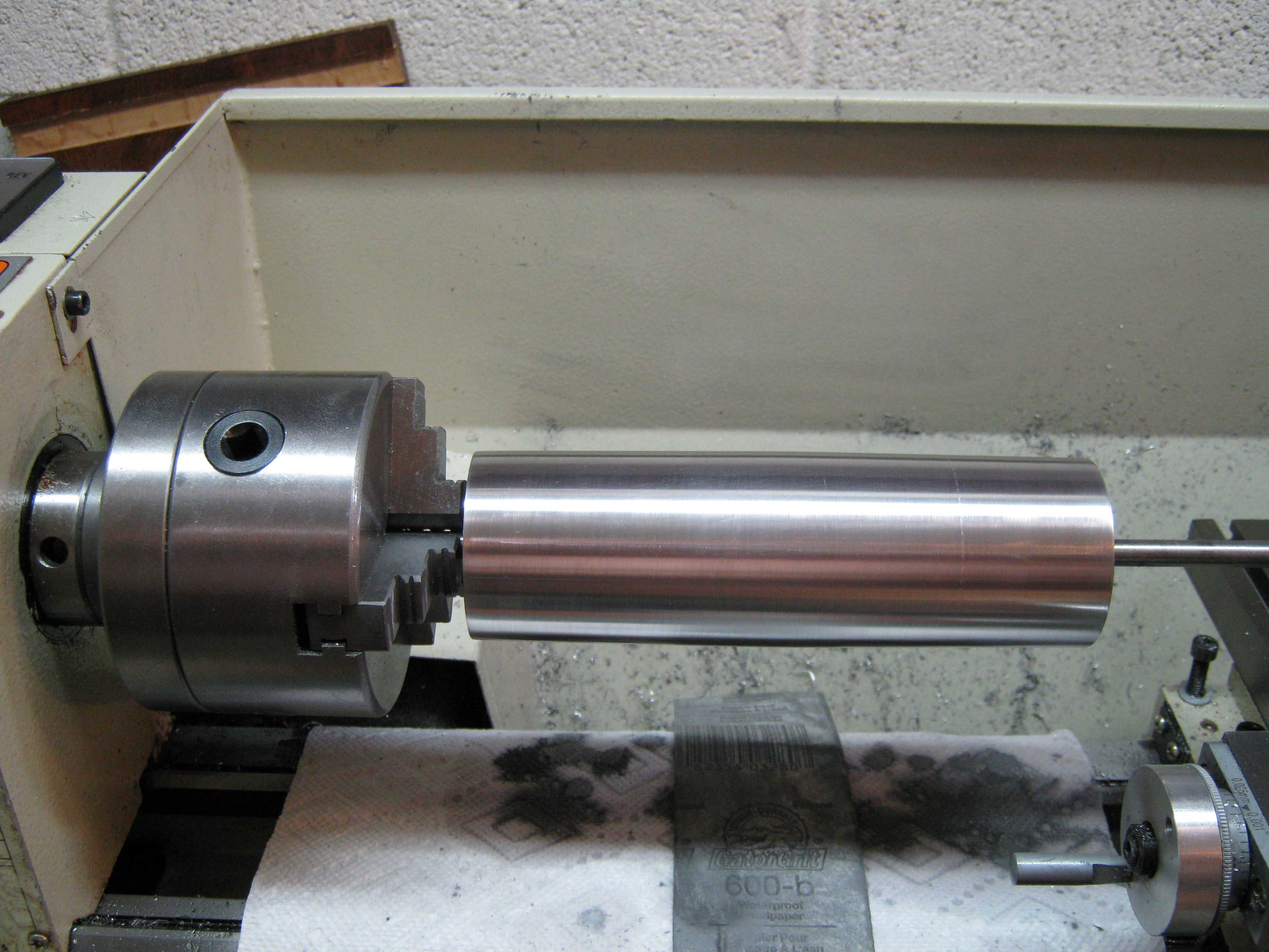 of the travel on the outermost portion of the roller. Now back out the cutting tool with the cross feed, and move the carriage leftward so that the cutting tool is slightly to the right of where the cutting stopped. With the cutting tool in slight contact with the roller, repeat the above operation from this new starting point to continue extending the slope to the center of the roller. Finally, flip the roller end-for-end so you can cut the other side. Next time, I think I'll just move the tail stock. Next time I'll cut a slope only on the outer 2 inches. |