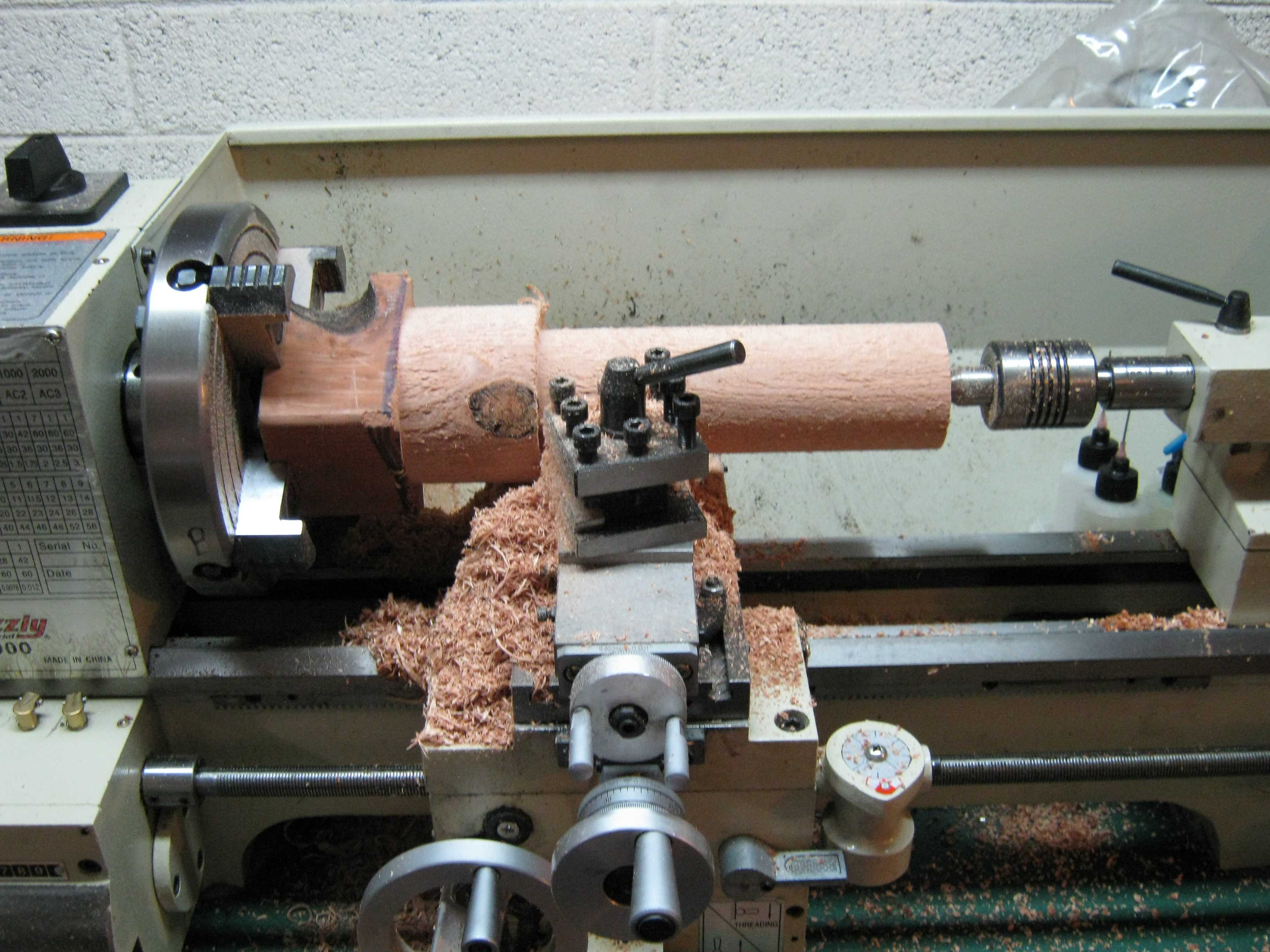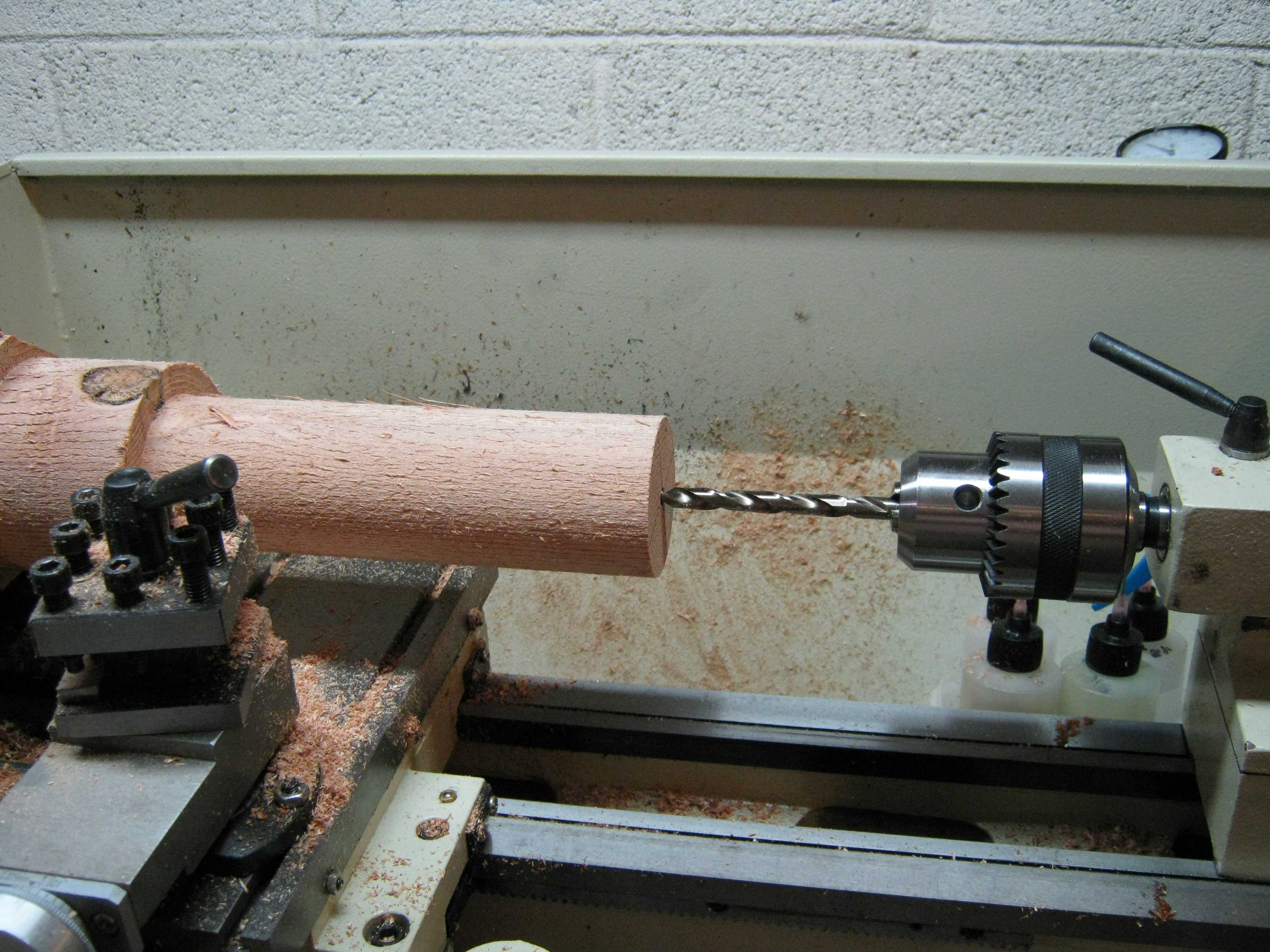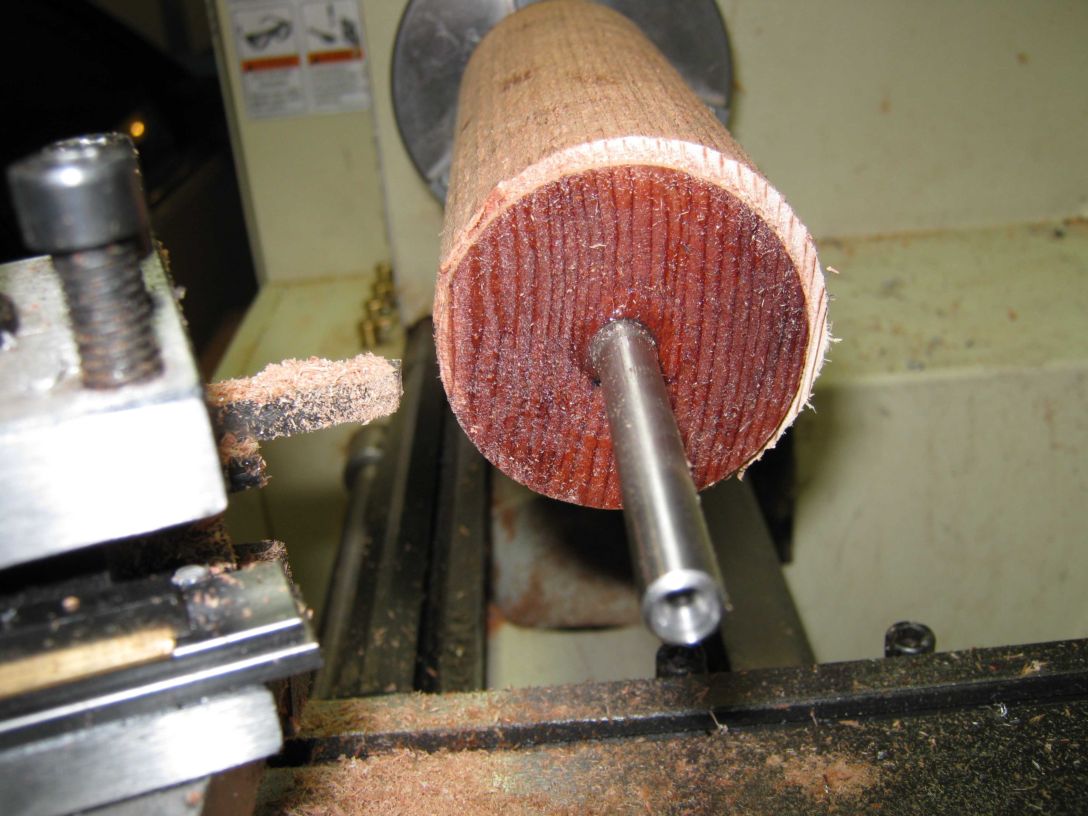 The core is roughed out from a 3.5" x 3.5" x 1 ft. piece of redwood. You can reduce the volume of chips by first cutting off the corners (lengthwise) of the redwood. | The core is pre-bored with a 5/16" ordinary "jobber"