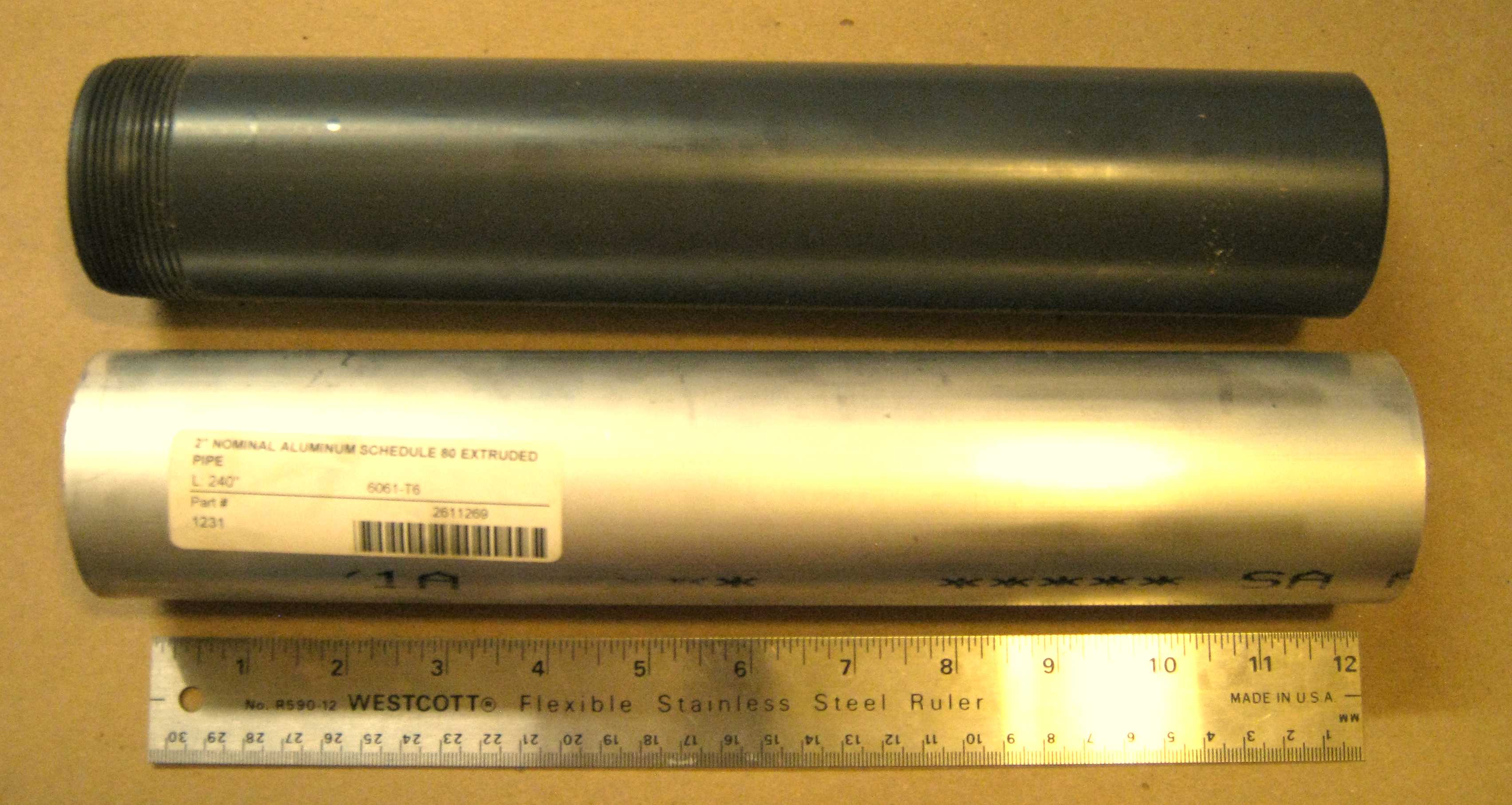 These are one foot lengths of 2" PVC Schedule 80 and 2" Aluminum pipe. They will be cut slightly longer than needed with a bandsaw. After being epoxied to their respective cores (different diameters), they will be end-finished to the correct length in a lathe. Any slight eccentricity relative to the axle can be turned out, and then a taper will be cut on each end of the aluminum roller. | The finished aluminum roller. After cutting, the rough surface is gently filed down with a flat, coarse file. Then the surface is sanded with 200, 400, 600, 1000, and 1500 grit wet/dry sandpaper. Kerosene (lamp oil) was used as a lubricant. The paper towel protects the precision ways of the lathe from sanding grit. Both the PVC and the aluminum rollers cleaned up okay. Finally, the surface is cleaned with alcohol to remove any very fine aluminum particles. |