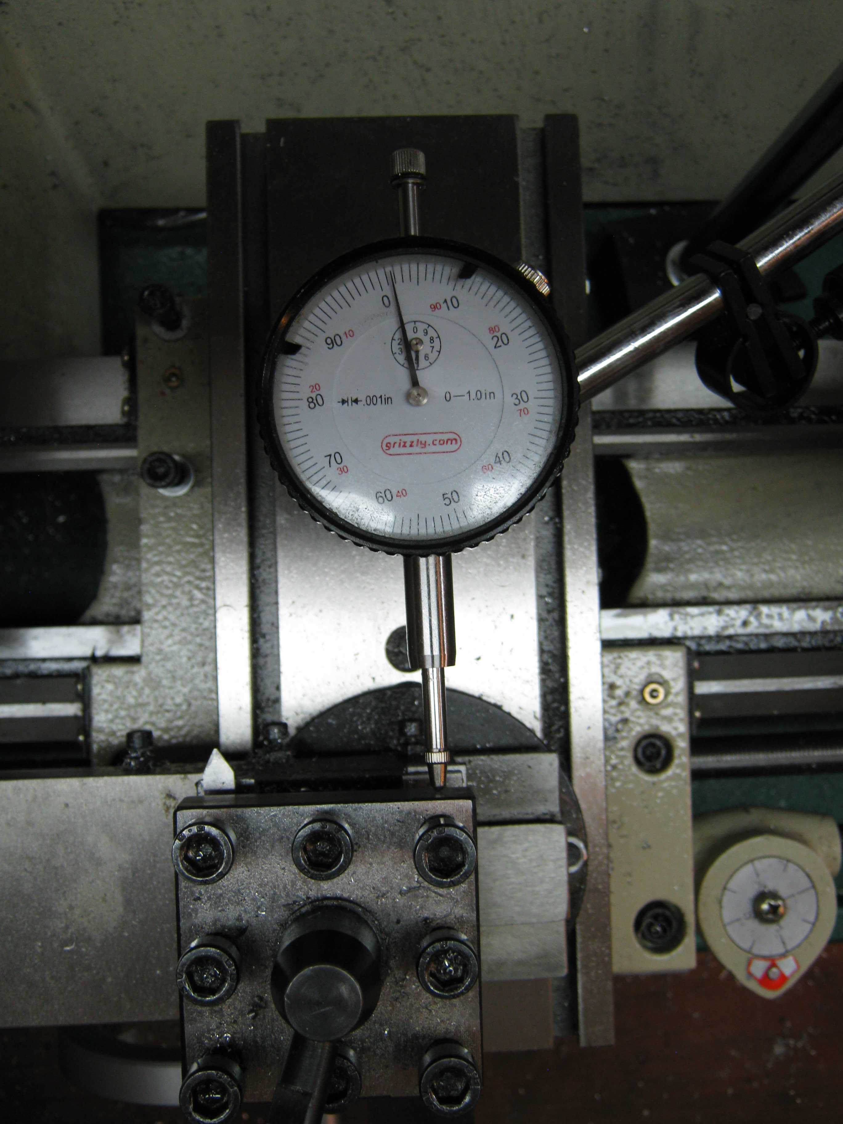 Next , with the indicator set at the right end of the flat on the tool post, crank the compound cross slide handle (at the left) to move the slide rightward; as it moves, it will also move slightly inward, causing the dial plunger to move inward also. For a full two inches of travel the plunger should move 2*tan(0.5) or about 0.017 inches.This verifies that the 0.5 degree setting on the dial actually had about the correct effect. | ||