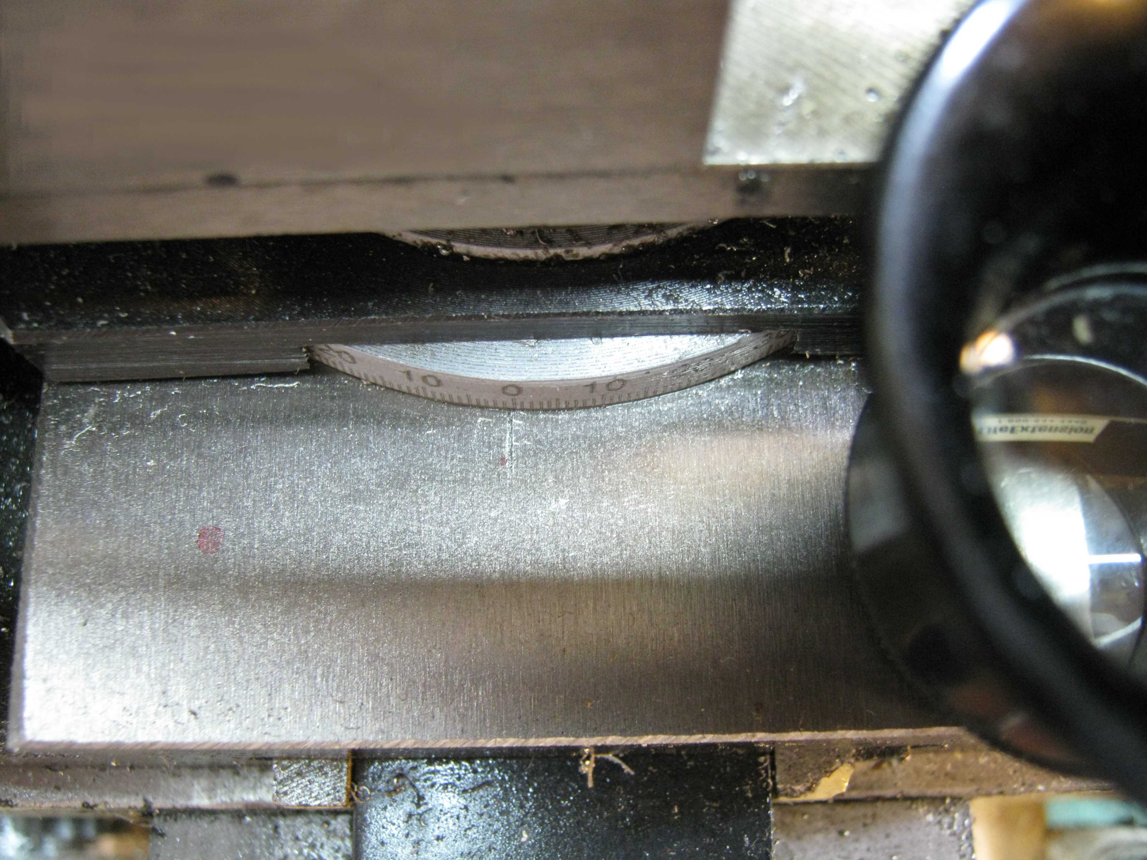 First, rotate the compound cross slide 90 degrees clockwise so that it will slide almost parallel to the lathe rails. Then turn it 0.5 degrees counter-clockwise so that the pointer indicates 0.5 degrees on the setting circle. (I had to use a jeweler's loupe, shown at right, to read the tiny scale) | Then check the setting to see if it does indeed offset the slide relative to the rails by 0.5 degrees. First, zero a dial indicator on a flat side of the tool post that is parallel to the rails. Crank the carriage right and left a little bit to check parallelity. Loosen the handle and adjust the angle on the post so that the dial indicator stays at zero when the carriage is cranked left and right for nearly a full 2 inches. This ensures that the flat on the tool post will move parallel to the rails. | |