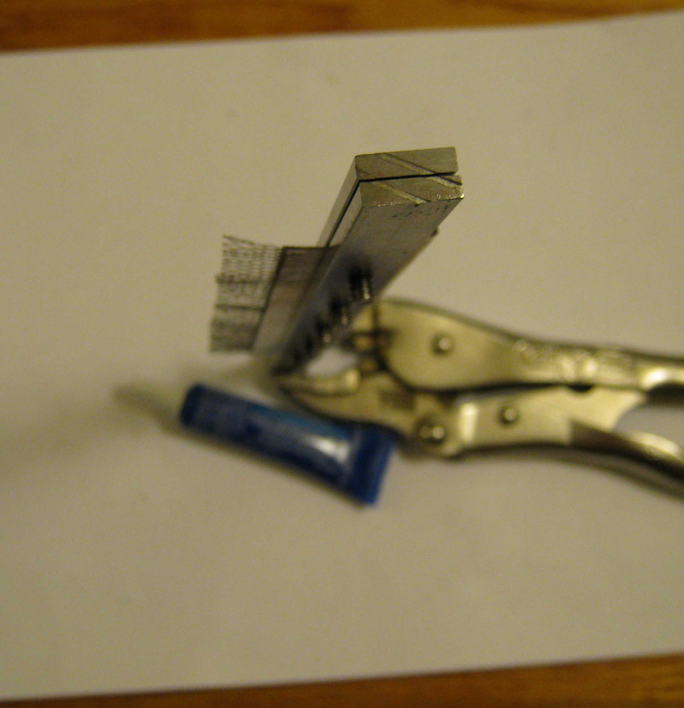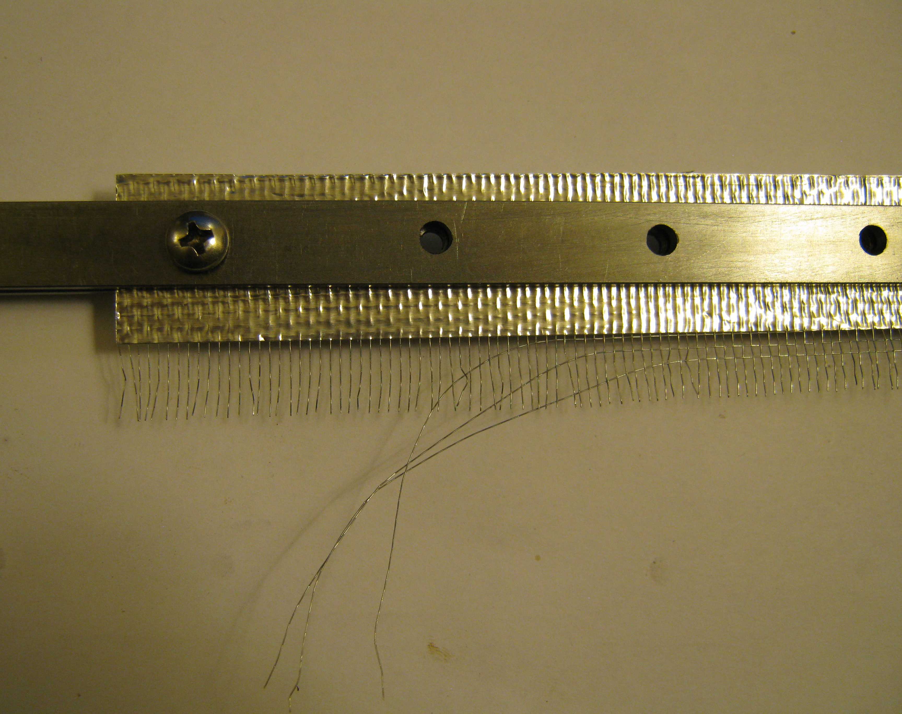 Some longitudinal wires on the screen will be pulled out to make a brush comb with HV emitter points. Brushes are fragile, and so combing and trimming are normally done just before the brush assembly is mounted into the machine. All remaing wires must be held secure by the tape so that they do not work loose with vibration. | The ends of the brush holder are marked with shallow hacksaw cuts to facilitate correct assembly. Lockwashers are used on all fasteners to keep the assembly in compression; thread locking compound (blue, medium strength) is used to secure the screws. |