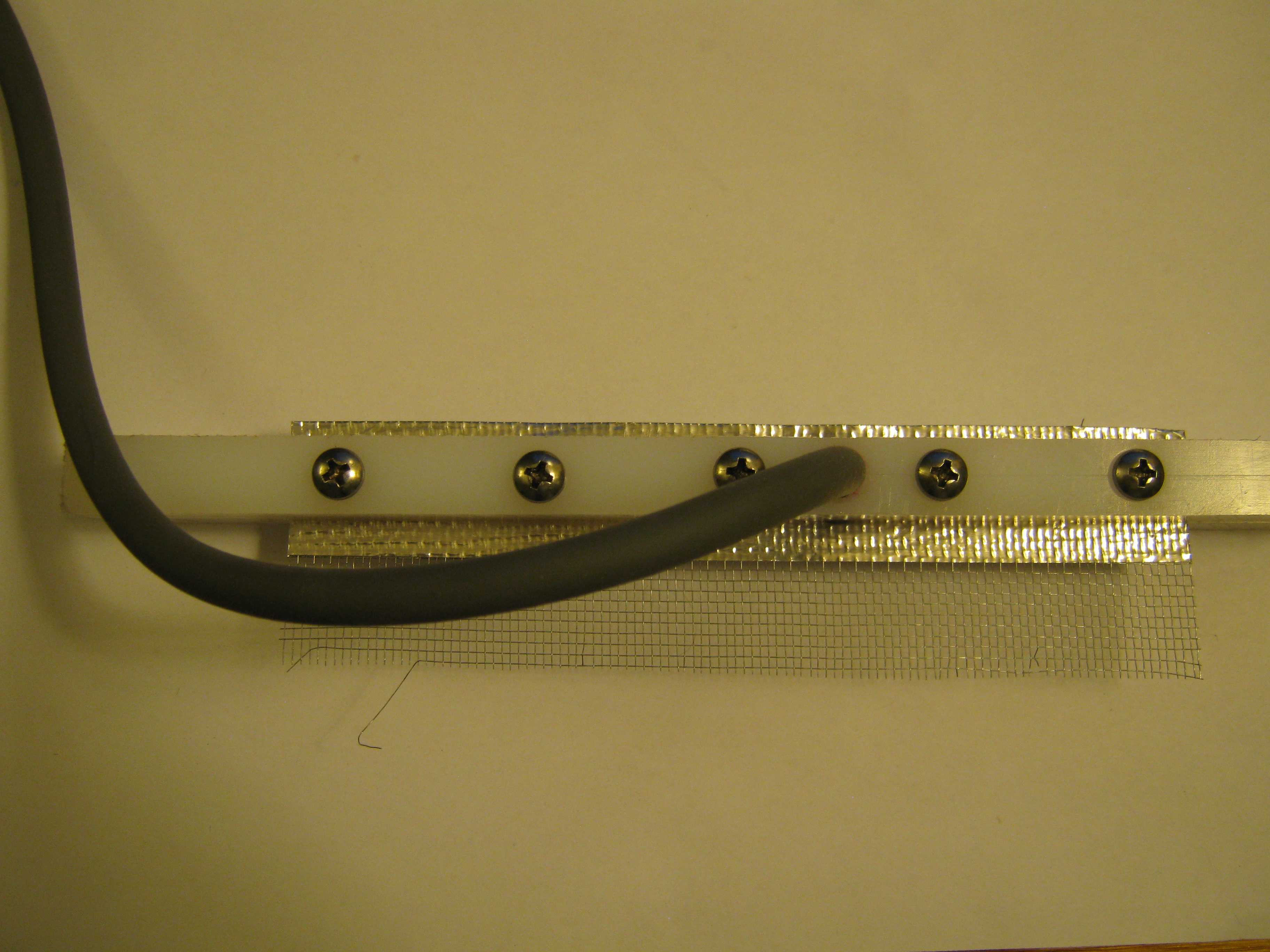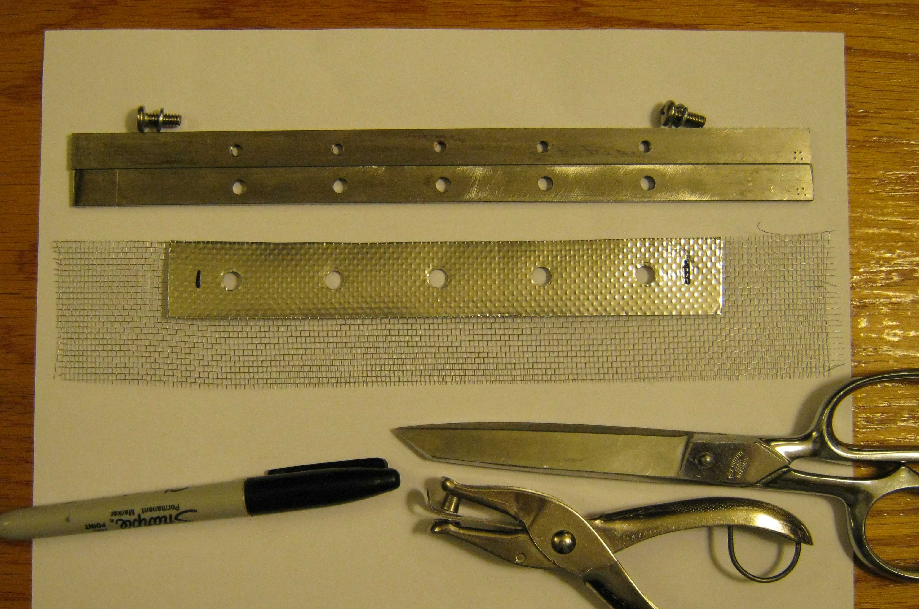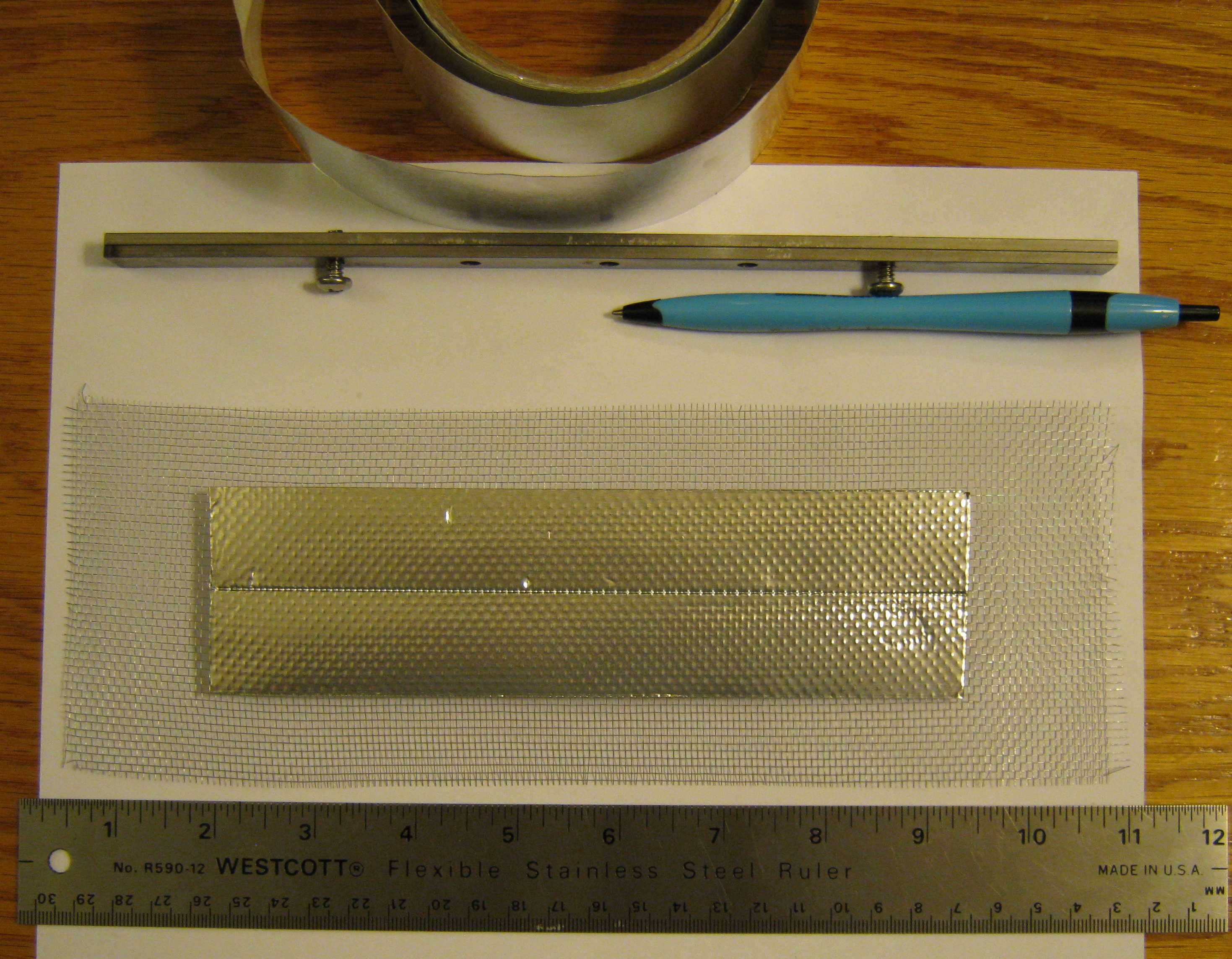 Basic method of making a brush consists of sticking metal (heating) tape 2 inches wide on both sides of a piece of aluminum wire window screen that is about 10 inches long and 3 inches wide. Both sides are taped to balance out forces that could cause curling. This piece is about to be cut in two, to make two brushes. | Holes for the screws are marked and cut with a paper punch. Screen will be trimmed to 6.5 inches for the upper brush and 6.0 inches for the lower.. |