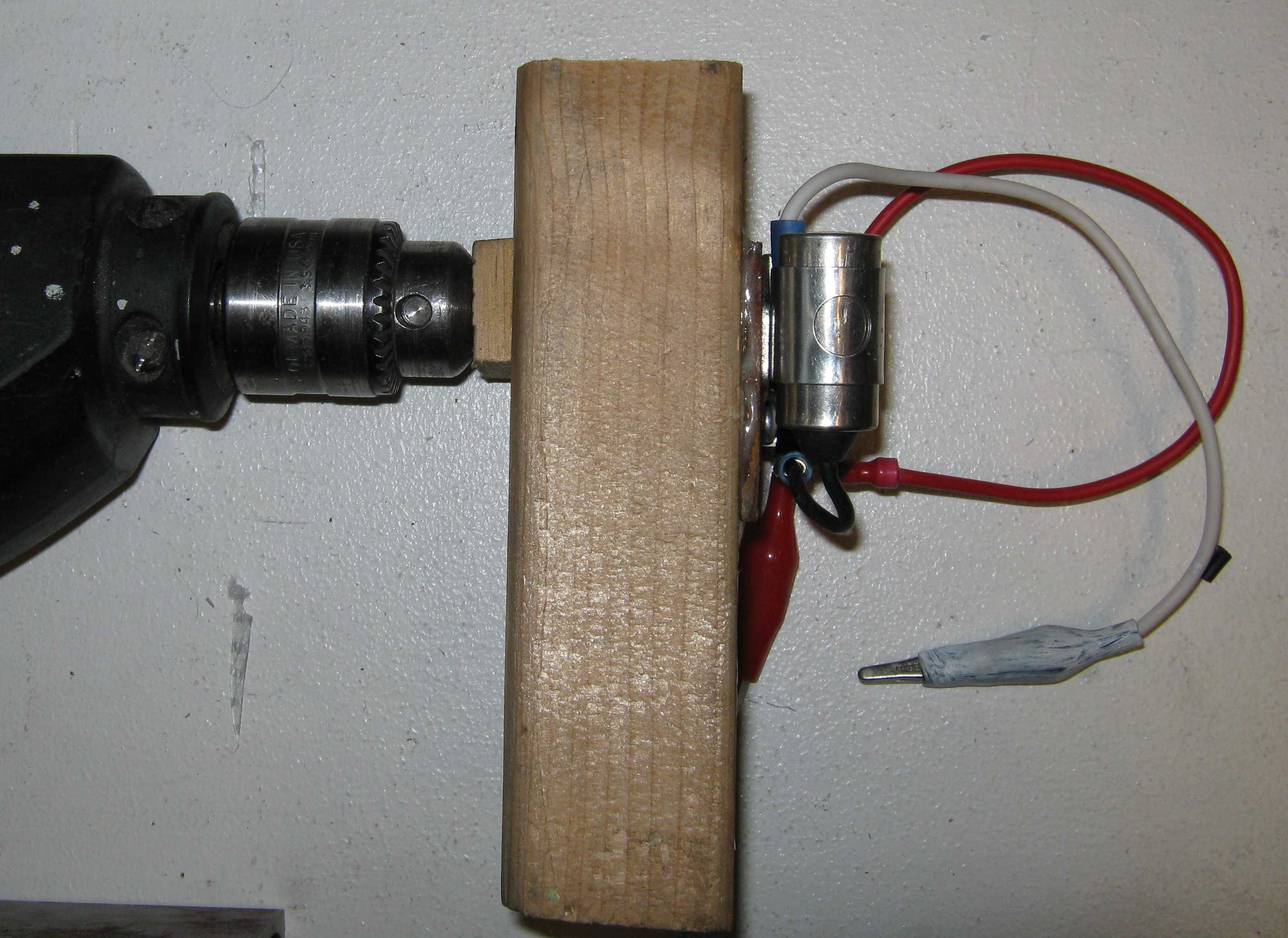 Cam was made from 0.625 square bar stock. It looks like a big bolt with a square head. The points are Honda CA102 CT200 CB92 CA95. The ignition points capacitor was obtained locally. | The cam is driven by a variable speed electric drill. A wood block serves as a bearing and mount. A 12V battery and a "universal" ignition coil, (ACCEL 8140 Super Stack) make up the rest of a very conventional "brute force" 25kV pulsed power supply. |