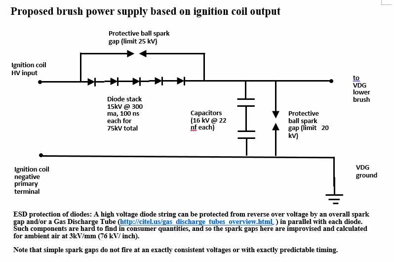 ignition systems. These have proved to be very reliable in practice. When I initially tested the van de Graaff, the lower brushes were connected to ground. The voltage produced at the upper terminal was purely triboelectric in origin (vinyl belt on a PVC roller), and I thought I could impove the output (about 80 microamps) by using a sprayed charge scheme. The apparatus below supplied 25 kV (or more) at 100 to 200 pulses per second. Unfortunately, when it was connected to the lower brushes, the tests showed no difference in current output. Hence, for now I have decided not to formalize this scheme. (Afterword: This problem was never adequately investigated. An ignition coil can produce a monopolar pulse but the inclusion of a capacitor across the breaker points will produce a ringing waveform. This will give a robust spark for a spark plug and is fine for automotive use. The ringing itself would not be a problem in this application if the waveform was always positive, but the setup as shown would produce a zero crossing waveform and would not be suitable here. However, a string of series-connected high-voltage diodes was found in the project box a year later. A test procedure was never written, and my memory of these trials is too fuzzy to be reliable. I hope to reinvestigate this problem sometime in the future. (Afternote: the diodes were later tested with a 9V battery, a 100 ohm resistor, and a voltmeter. Tests showed all the diodes were "open" and non-functional. They were NTE517 microwave oven diodes (15kV @ 500ma). These are probably not suitable for fast switching applications. ) |