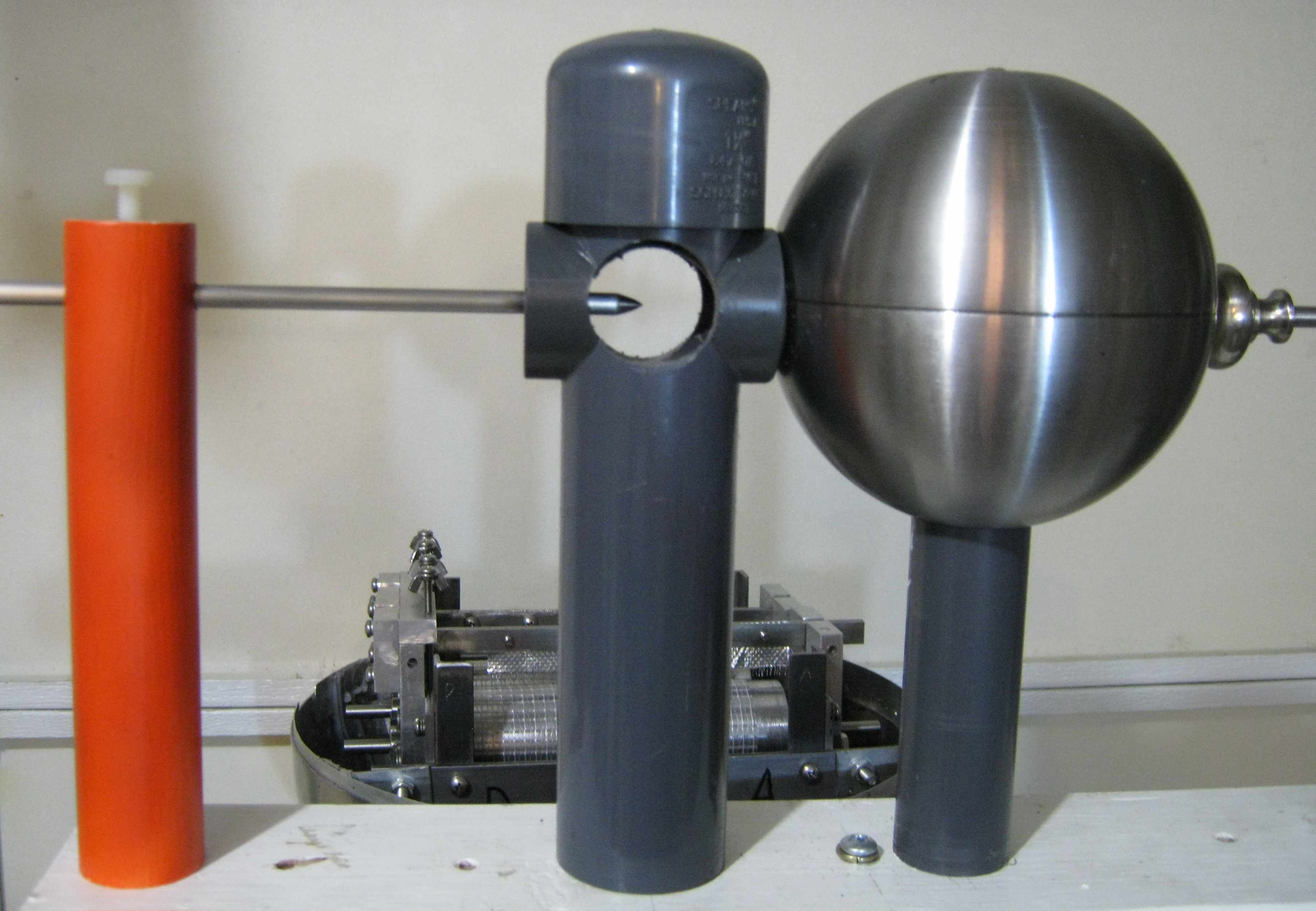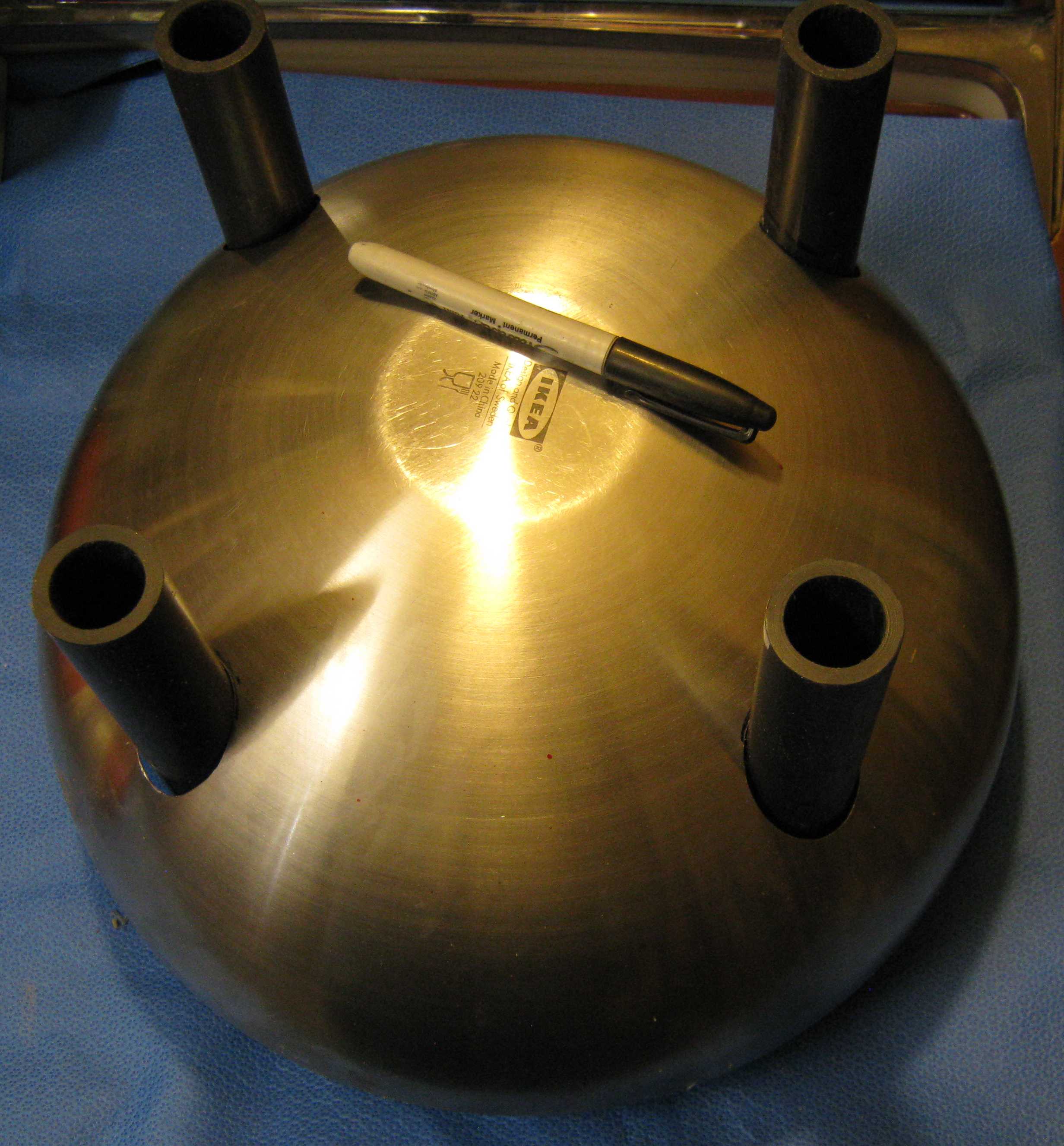 The upper Terminal is made from two Ikea 14 inch serving bowls (rimless). Strips of 0.032 inch aluminum sheet are glued on one hemisphere to assist in joining the two hemispheres. Surface preparation and cleaning are crucial for good adhesion. Always run adhesive tests so you will not get any surprises after final assembly. |