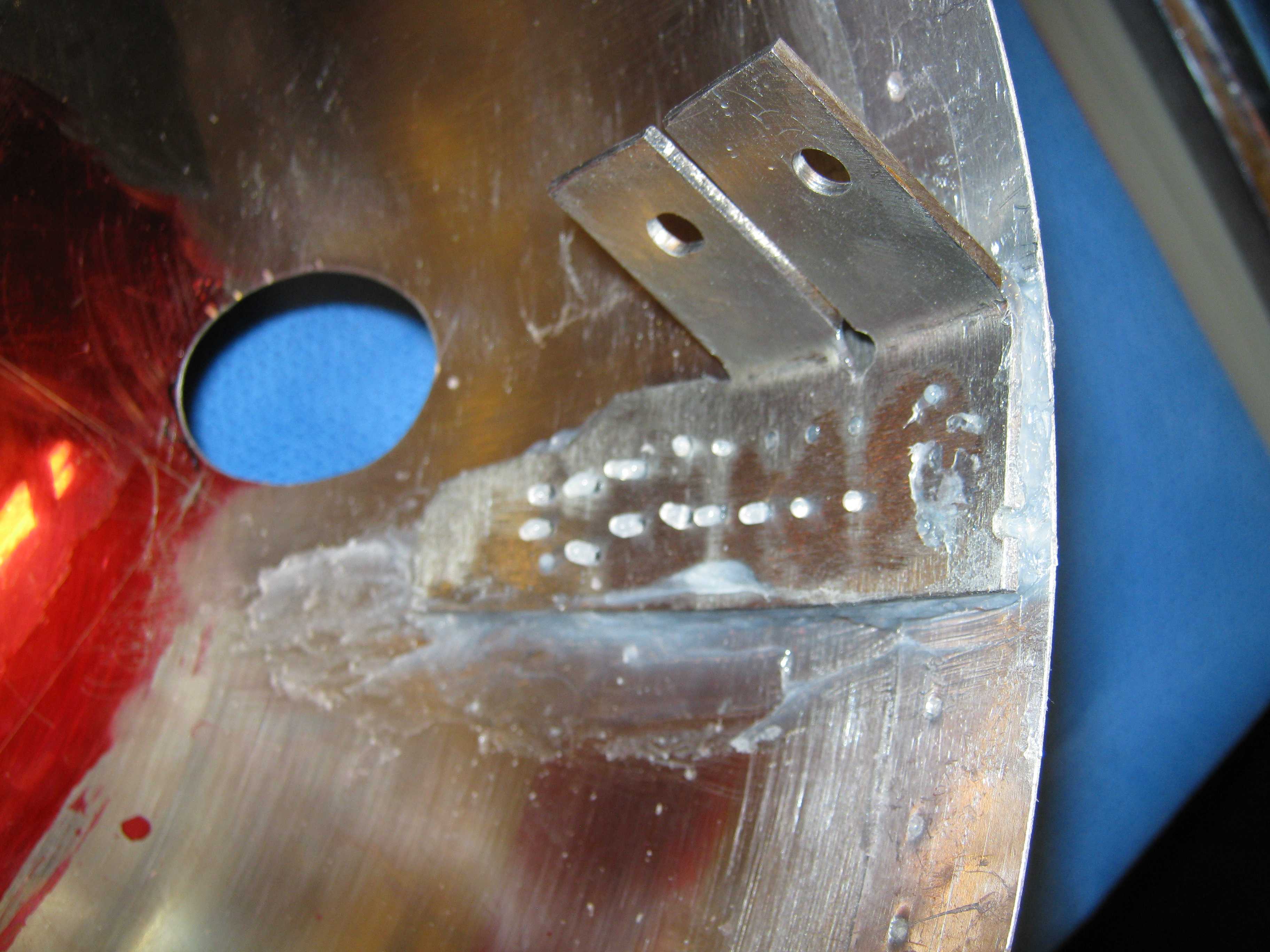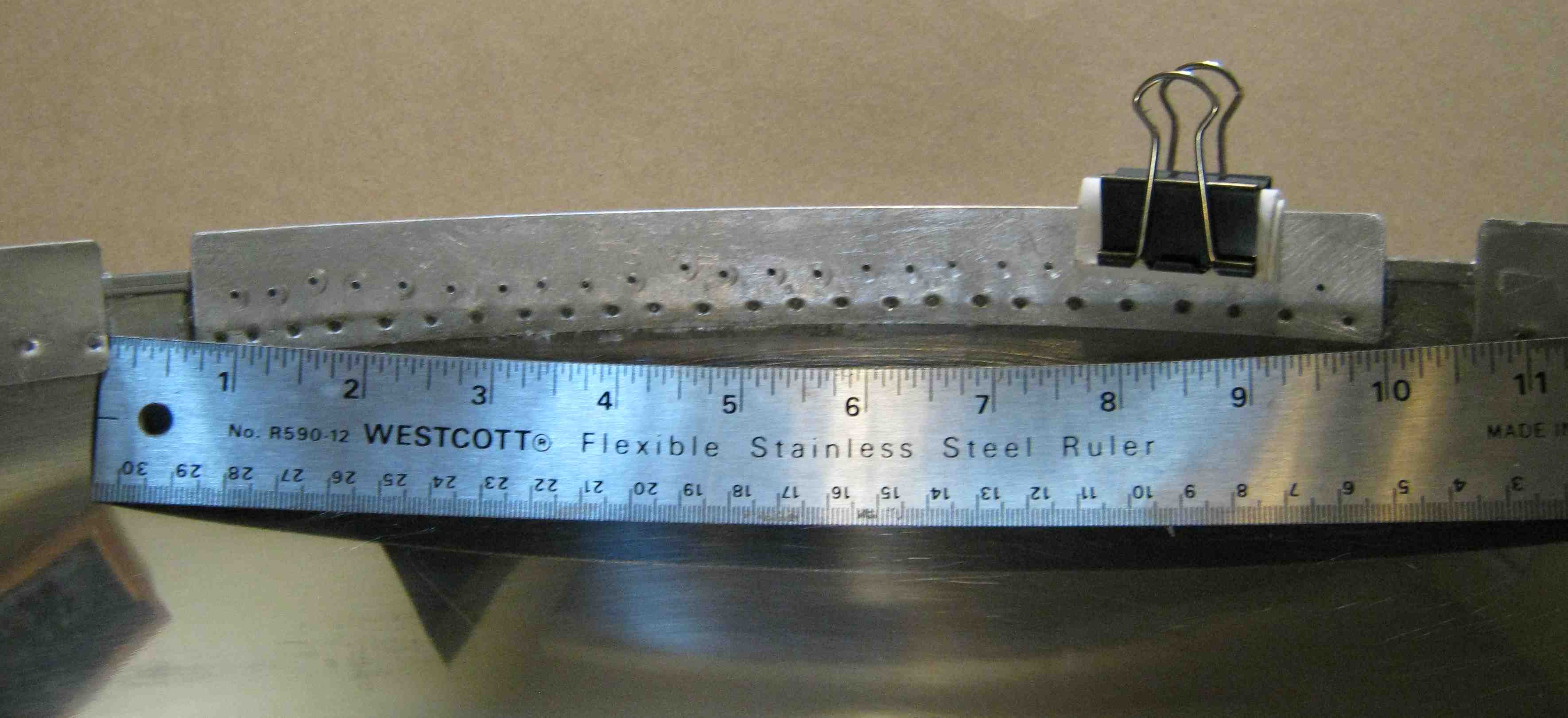 This is an alternative method of gluing the strips (several clips are used, only one is shown). Silicone I sealant was chosen because it had good adhesion. The holes in the strip are needed to help the silicone set properly. The strips tilt slightly inward to facilitate joining with the other hemisphere. | This is the way holes are located for the supports. Tighten all the fasteners on the upper terminal frame, then place the frame (without the PVC legs) into the hemishpere. Make the frame level (equal offsets) with the edge of hemisphere. With a scribe, mark the points where each corner of the angle iron meets the hemisphere. (Layout dye might be helpful here.) |