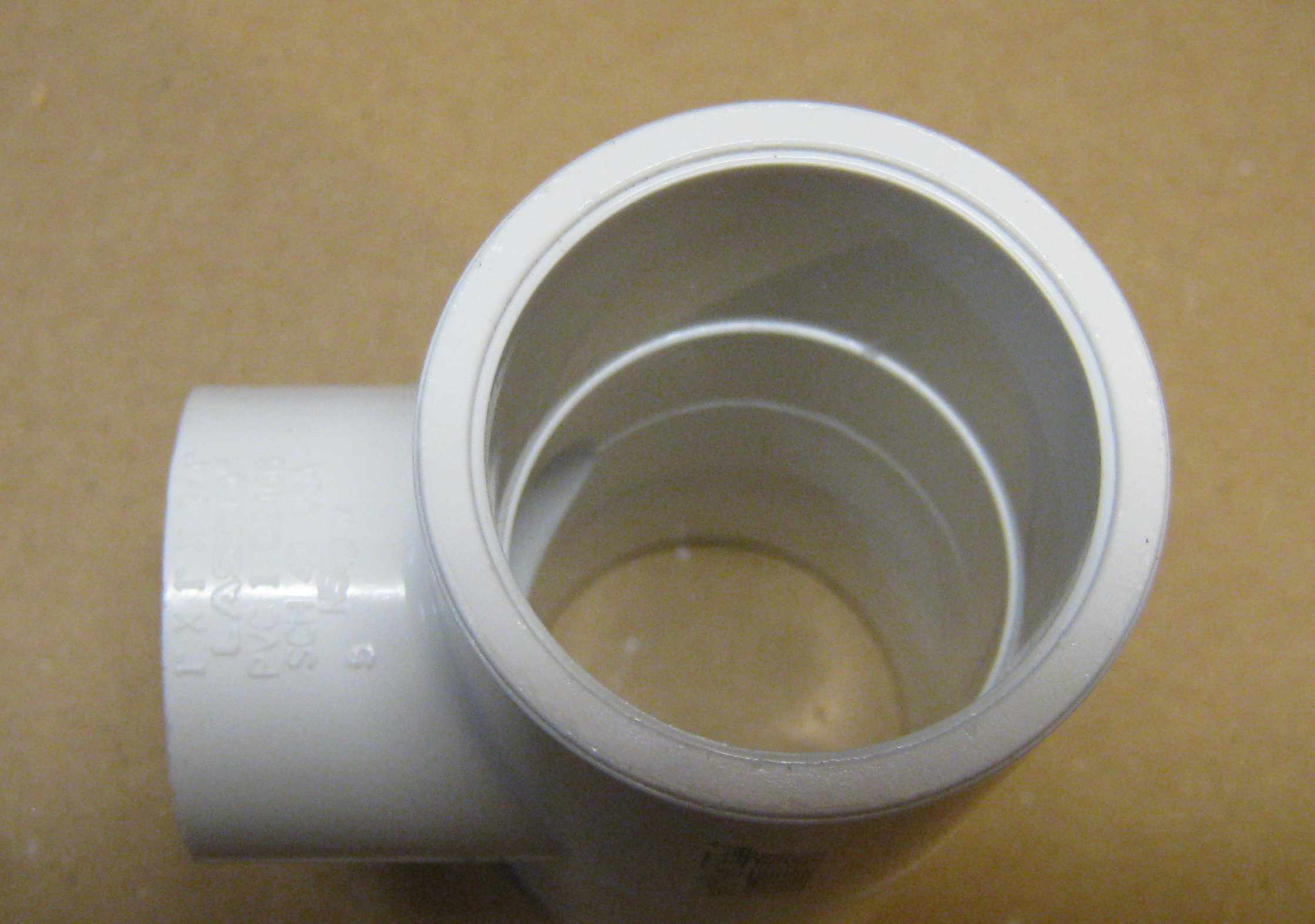 The PVC tee (schedule 40 (slip) 1" x 1" x 3/4") has an internal ridge which should be bored out to make the internal surface flush with the column tubes. | Clamp the 1" side of the tee in a 4-jaw chuck and then "dial it in" so that it is centered. Then bore out the ridge. |