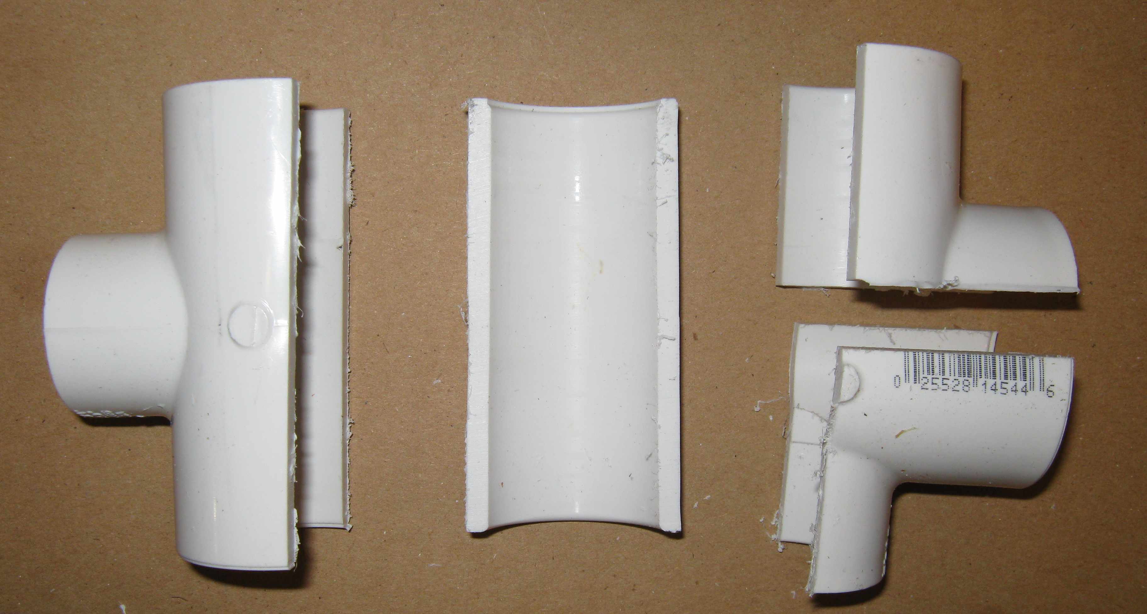 The 4 sets of ring mounts were made from 8 PVC tees 1" x 1" x 3/4", schedule 40 (white). Each tee made two mounts. The longitudinal cuts were off-axis so that they snap onto the column supports on the van de Graaff. The supports can be further secured with double-sided tape if necessary. This shows how the original tee is cut. The piece in the center is scrap (note the lack of a ridge). The two pieces on the right make two separate corona ring supports. |
