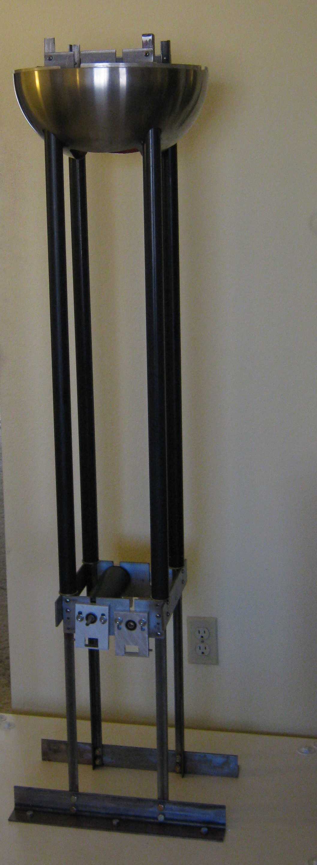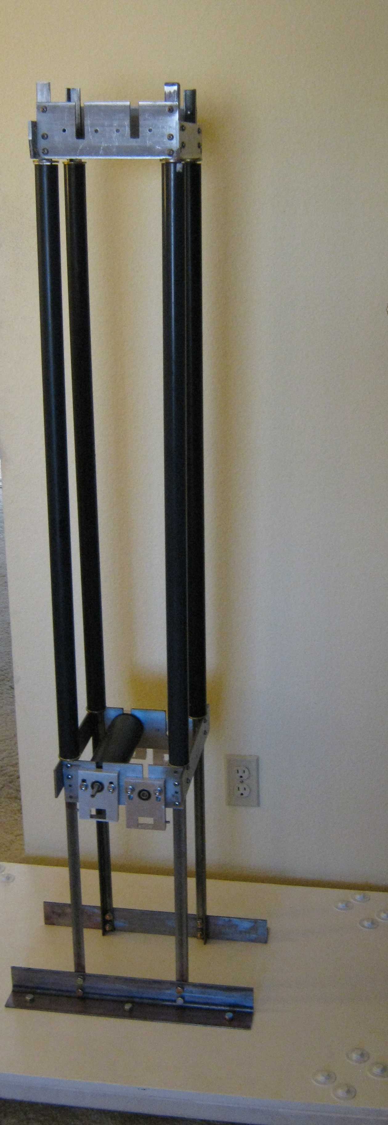 This is the basic skeleton or frame of the van de Graaff. Despite the lack of diagonal bracing, the frame is still fairly stiff. Note the open slots for the bearing plates; this facilitates removal of the rollers for belt changes. This open configuration is used for initial testing of belts and rollers. |