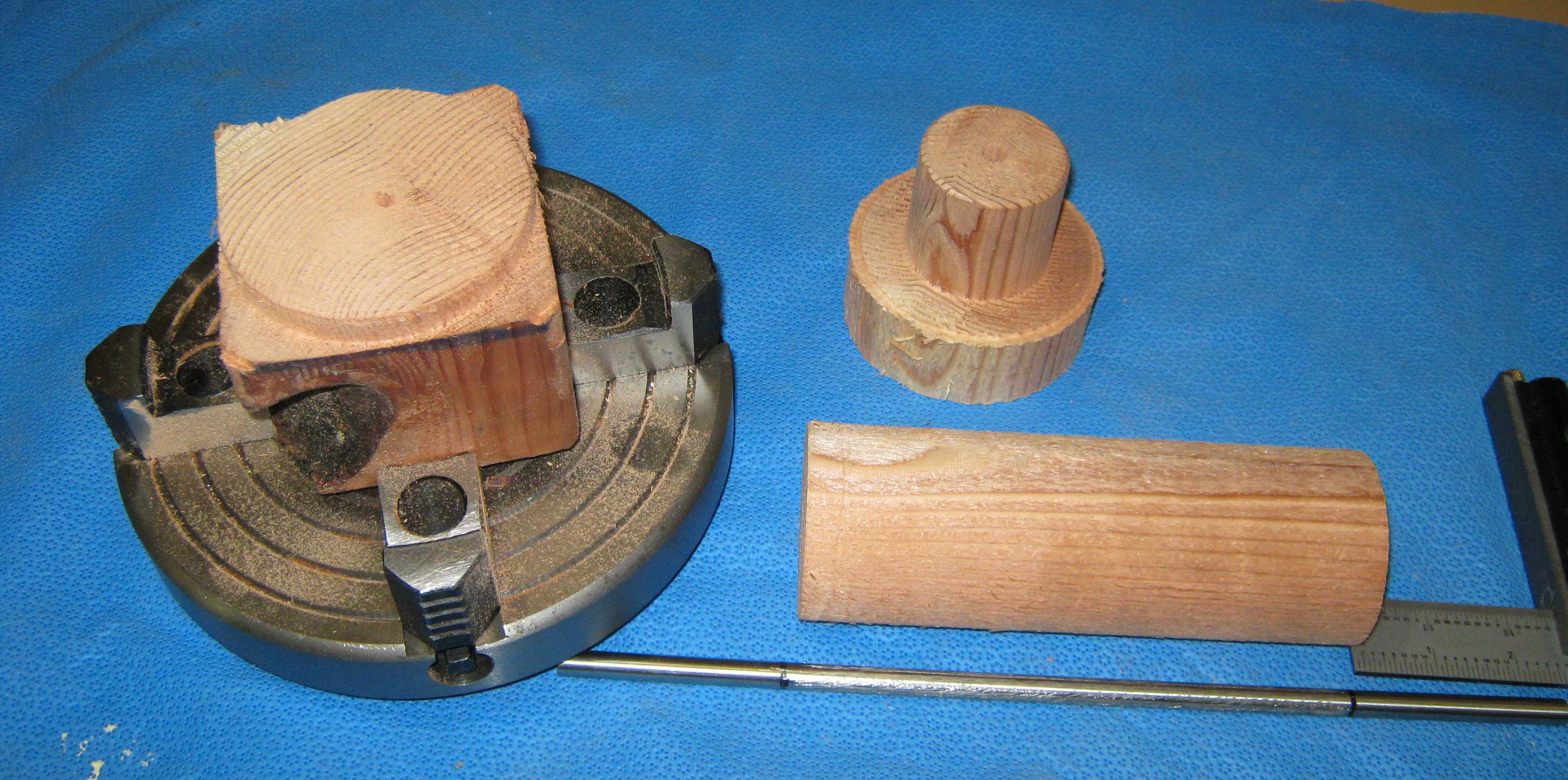 | The core is turned down to somewhat larger (0.25") than the final target diameter. The core is then cut off from the redwood blank. Note that the stainless steel axle is significantly longer than the core itself. | A 5/16" stainless steel rod serves as the axle. To improve torque capacity, shallow longitudinal grooves are cut into it by scraping it with the edge of a coarse file. |