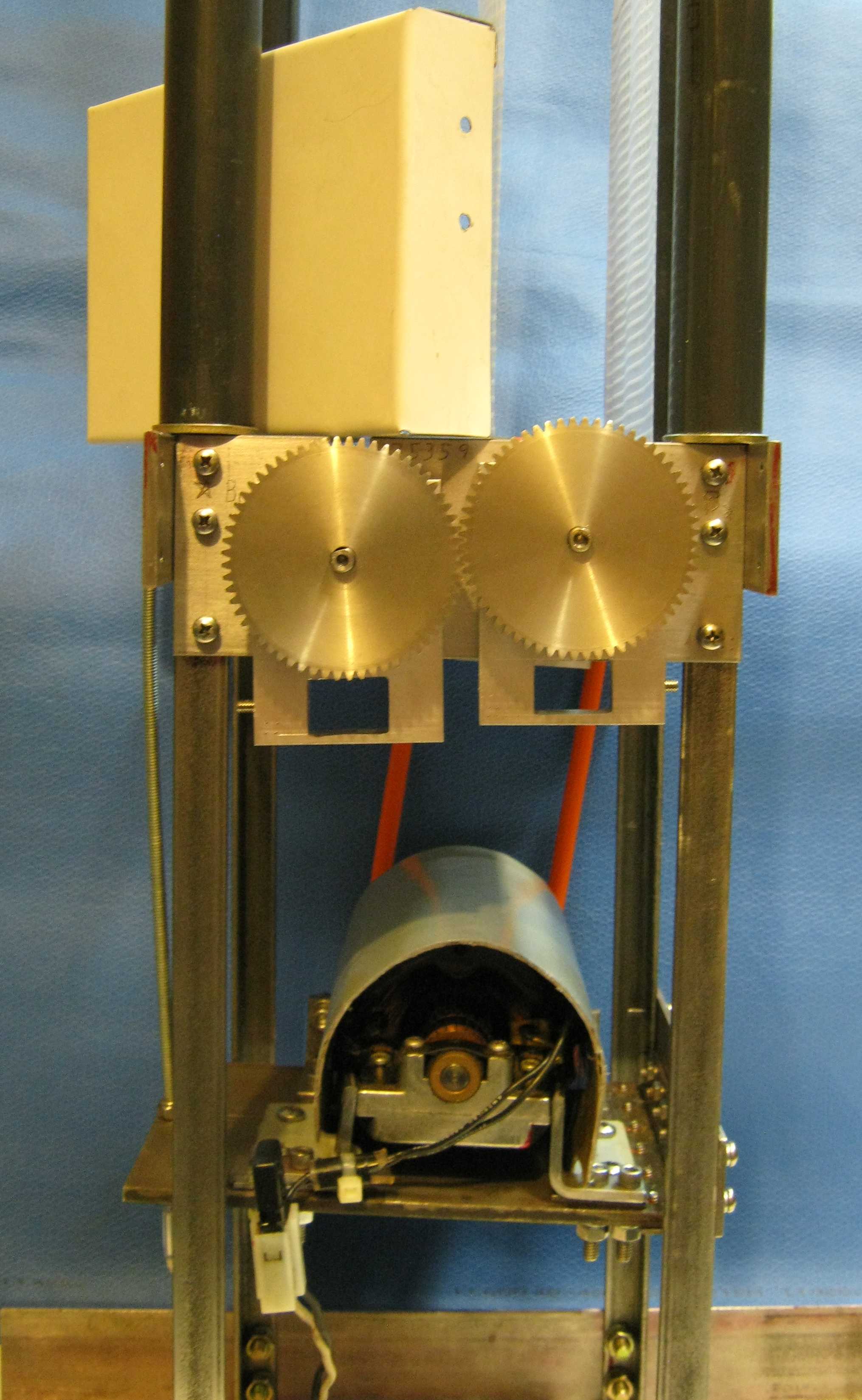 above. The stainless steel gears are expensive and noisy; an alternative scheme could use two pulleys and a figure eight belt. |