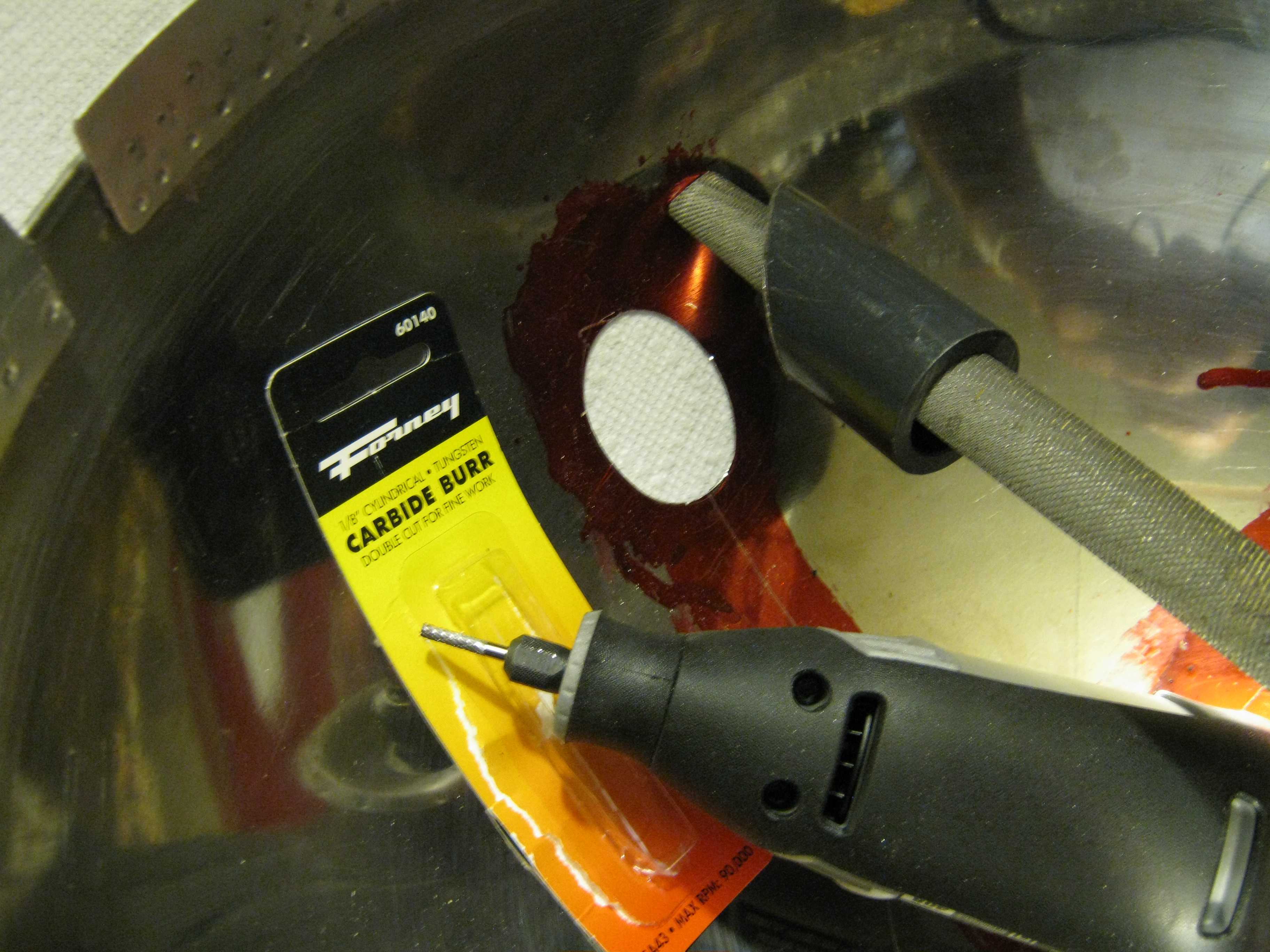 matches the surface of the hemisphere. The stub is then moved successively to each mark made previously by scribing the angle iron corners. The stub is positioned so that the mark is at the high inside edge of the stub, and the stub is vertical. The outside perimeter is then scribed to mark where the holes will be cut for the PVC legs. | After the 4 holes are scribed, they are carefully cut out with a Dremmel tool with a cylindrical tungsten carbide tip. The final shaping is done with a half-round file. |